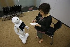 Photo by Shizuo Kamabayashi of the reporter in action interviewing a robot for an AP Story in 2015.