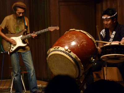 Isaku Kageyama with Daisuke Watanabe and Chris Holland of Amanojaku Tokyo’s top taiko group led by master drummer and composer Yoichi Watanabe play in a collaborative concert with Yuu Ishizuka, and Makoto Sekine.